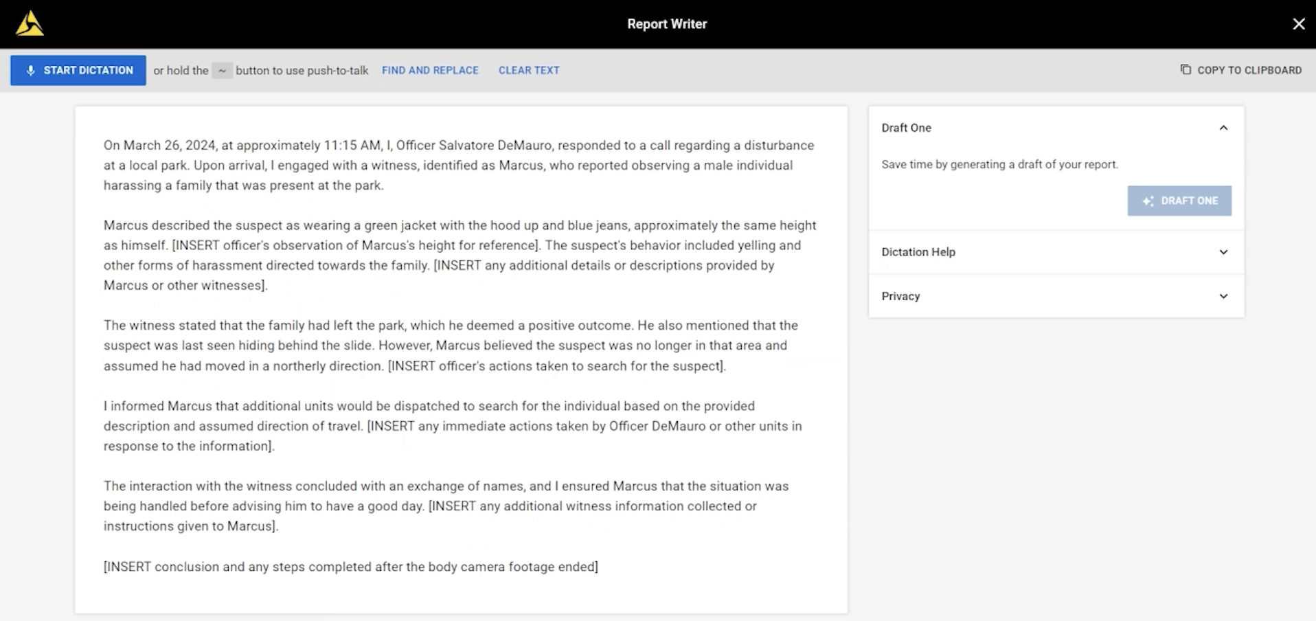 It’s important to note that the use of Draft One is not the last element in the report writing process for law enforcement. Once the report is submitted by the officer it routes to supervisors, report clerks and staff for further review and approval to ensure accuracy and agency accountability. The use of Draft One in this process is also denoted in the report's digital audit trail.