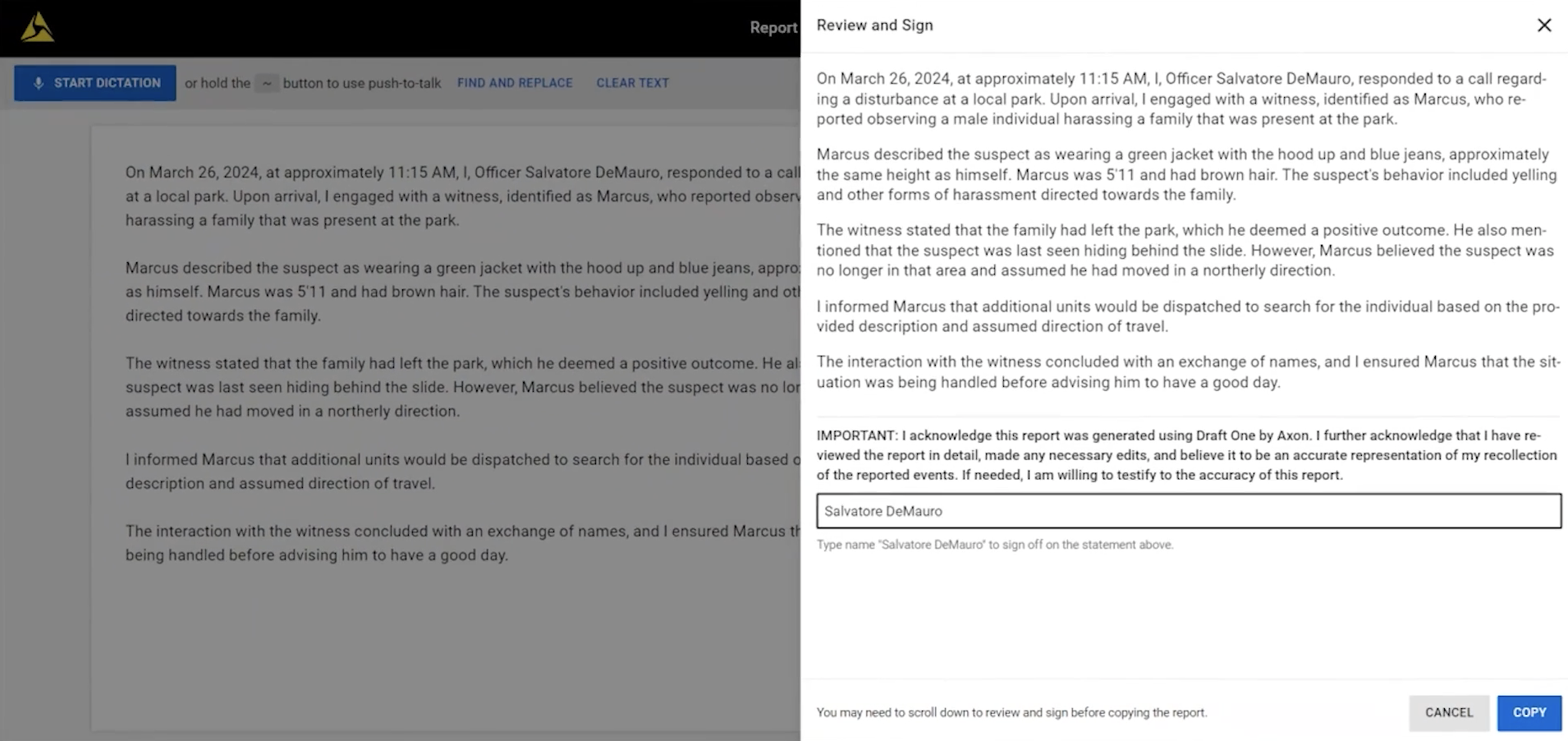 Draft One enables officers to get a head start on report writing by using artificial intelligence (AI) to draft a report narrative using the officer’s body-worn camera audio. After reviewing, editing and signing off on their reports, officers can submit the paperwork into Axon Records or into their third-party RMS for the next step of human review with their supervisors.