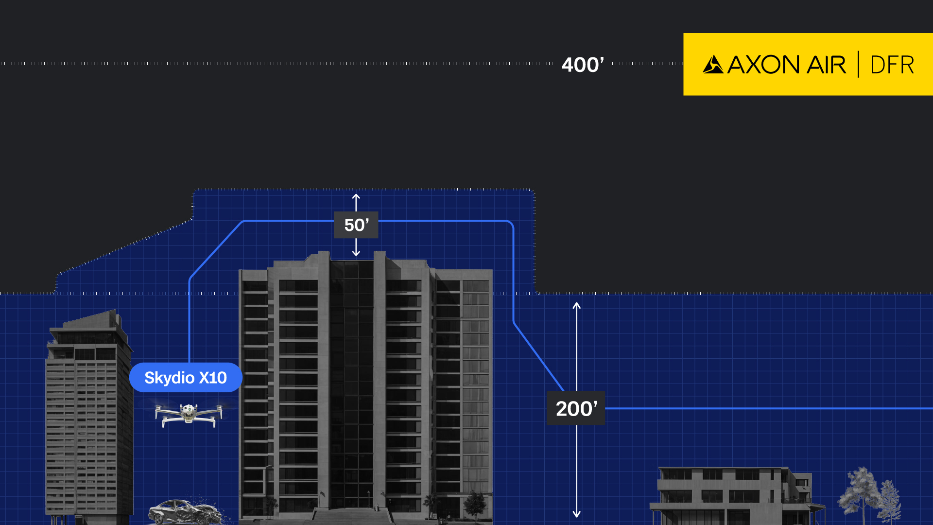 Axon Air DFR uses Skydio X10 drones equipped with onboard autonomy, allowing agencies to fly at or below 200 feet and within 50 feet of structures while staying within FAA guidelines. The FAA refers to this as Shielded DFR Operations, where the proximity of buildings naturally shields the drone from potential conflicts with manned aircraft, which wouldn’t typically operate close to structures.