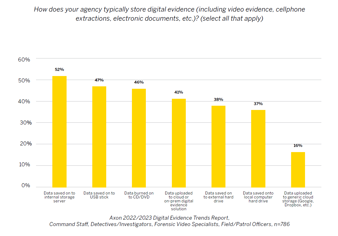 There are a myriad of solutions out there for storing and managing digital evidence, and the typical police agency is using at least 3 different solutions to store all of their digital evidence. One of the most popular storage solutions is burning the data to CD/DVDs, with 46% of agencies storing or sharing digital evidence through a method that is no longer used across most other industries.