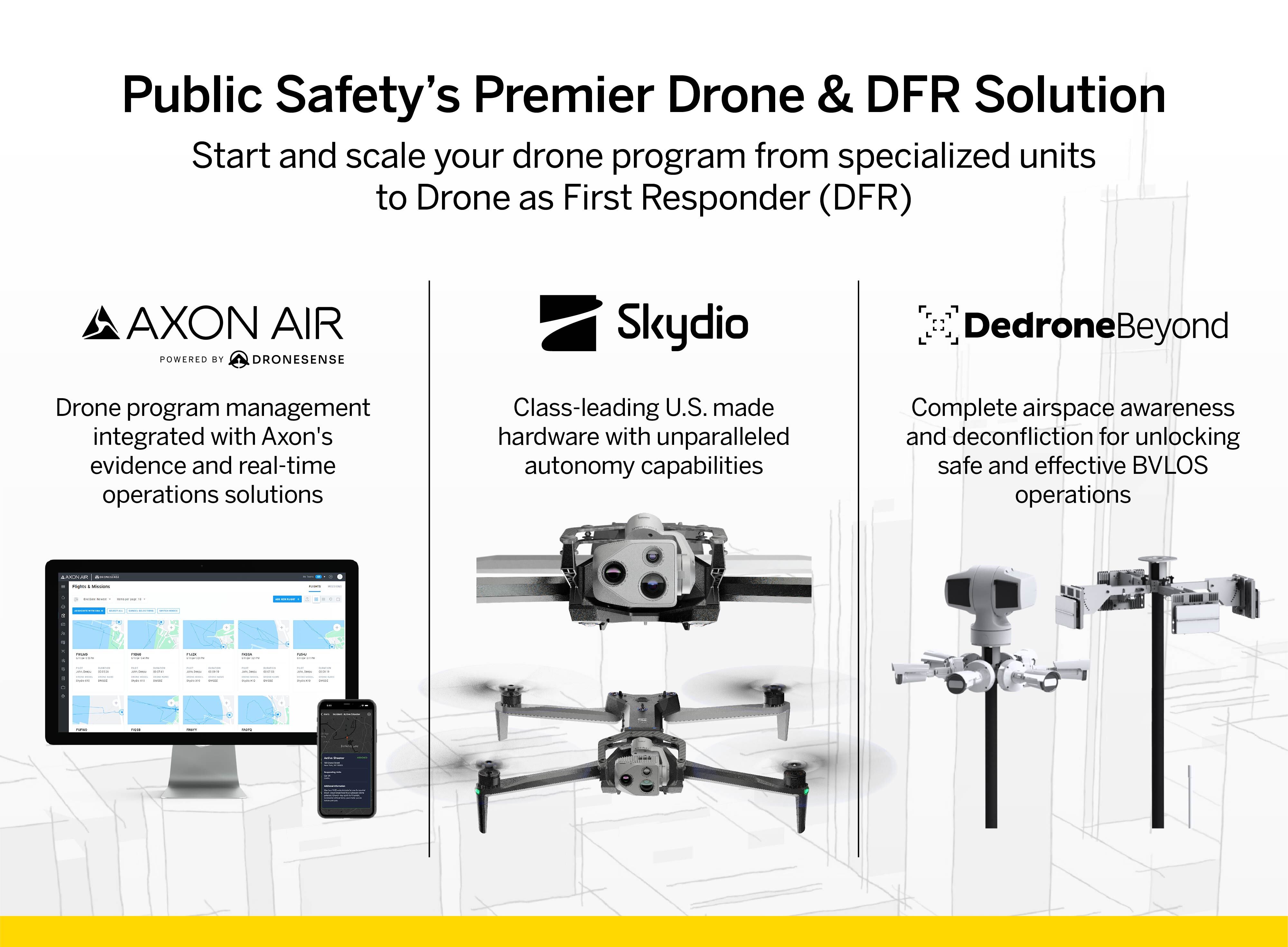 Axon expands alliance with Skydio, the leading U.S. drone manufacturer, to provide a more comprehensive, scalable drone offering for public safety. Read on to learn more about how this partnership will enable greater use of Drone as First Responder (DFR) programs in public safety and beyond.