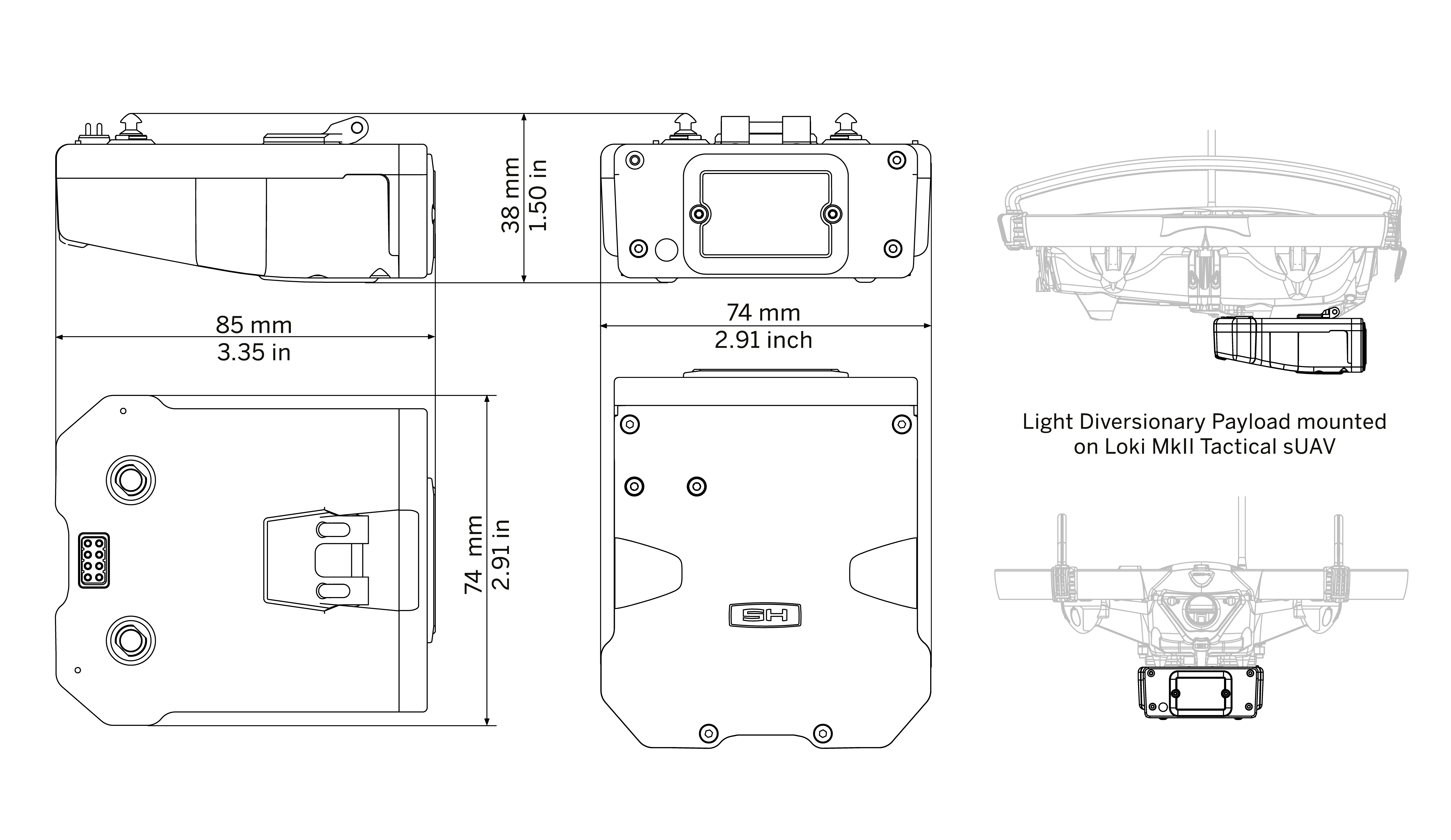 The Sky-Hero by Axon Light Diversionary Payload can be used interchangeably on all Sky-Hero by Axon small uncrewed ground vehicle and air vehicle (sUGV) models, including Loki Mkll, Sigyn Mkl and Narfi Mkl