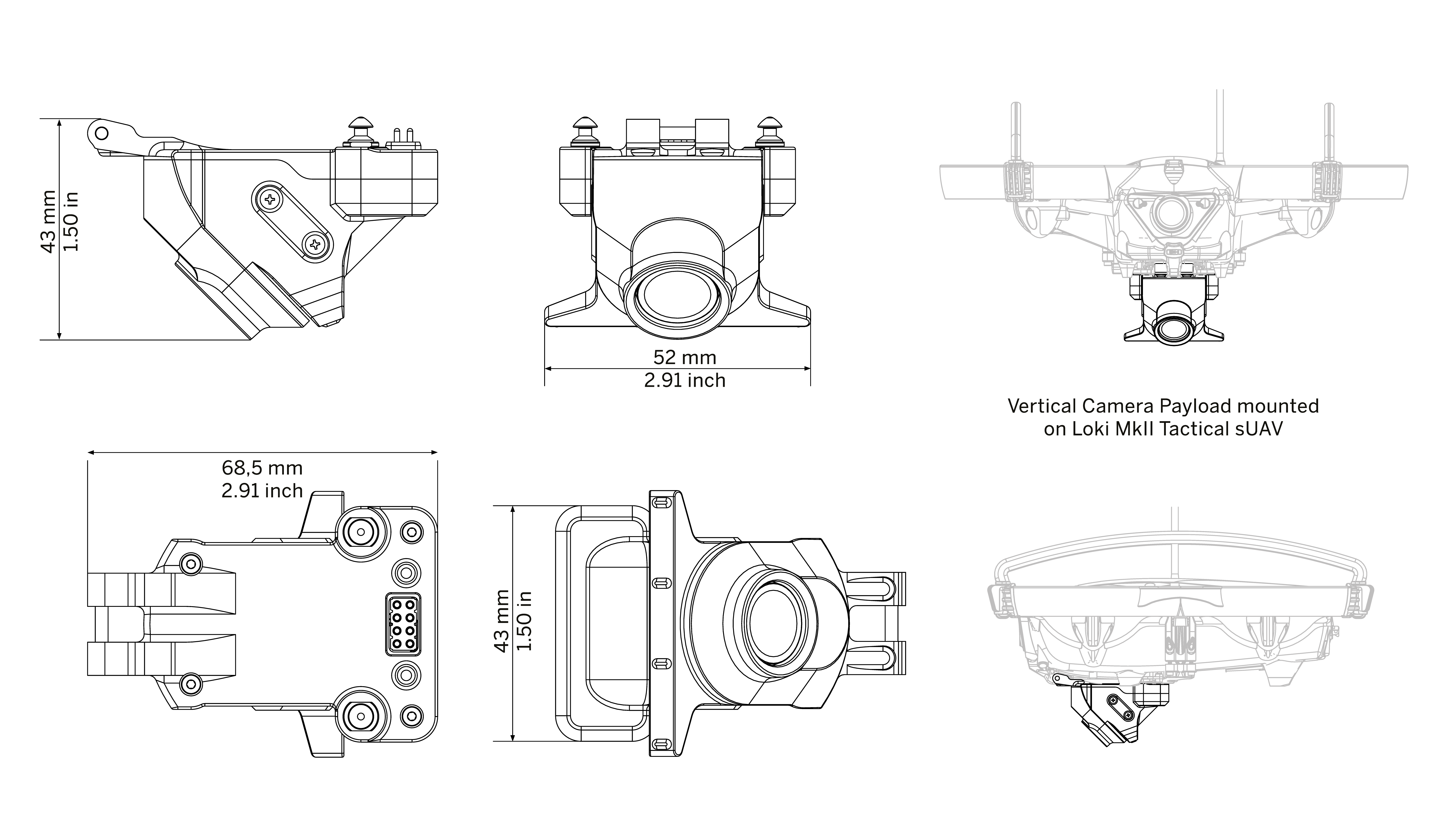 Our vertical camera payload provides uncrewed vehicle operators with a new option in operational situations. It enhances the flight context by making it easier to determine the orientation of stairs, for example, or to locate a narrow passageway in a ceiling. It also helps gather evidence or identify threats that would otherwise be difficult to detect, such as those that might be present in a fully loaded truck/container, or a warehouse full of boxes and materials.