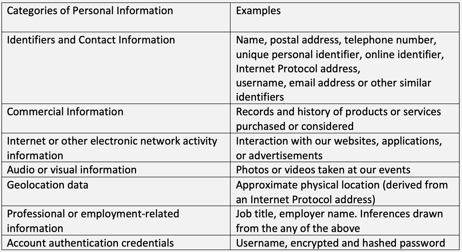 Categorias de informações pessoais coletadas